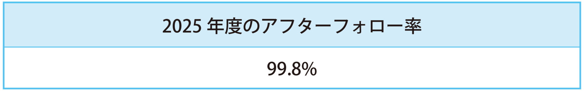- 70歳以上のお客様に、保全手続き以外にもアフターフォローを実施することで信頼と安心を得ていただき、末永くお客様を守る体制を目指しております。