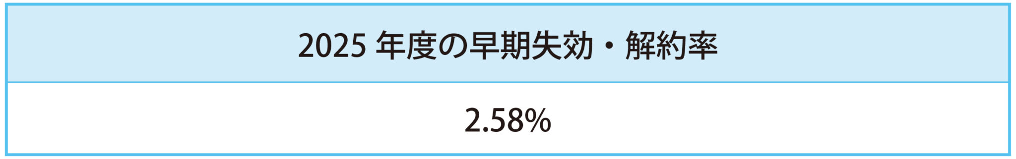 - お客様のご意向を十分に把握し、知識・財産状況等を把握した上でご意向に沿った保険商品のご提案が出来ているという指標として、当社はご契約から13か月以内の早期失効・解約率を基準としております。